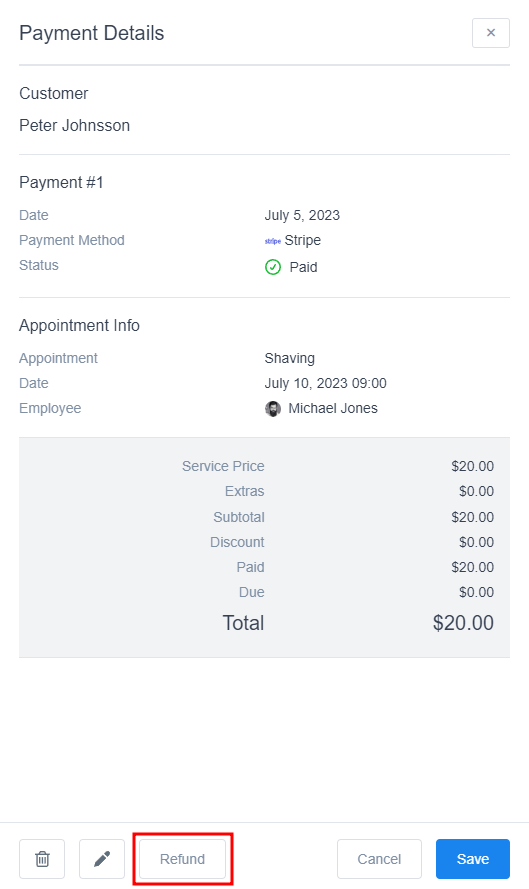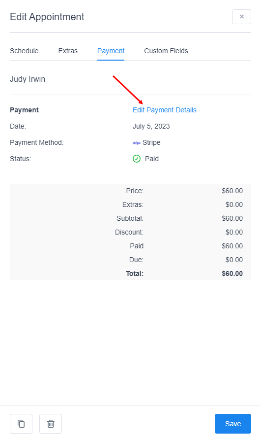 Another way of refunding a transaction would be by editing the appointment. In there, you’ll see the “Payment” tab and in it – the “Edit Payment Details” link. Clicking this link opens the “Details” tab, just like when accessing it through the Finance section.