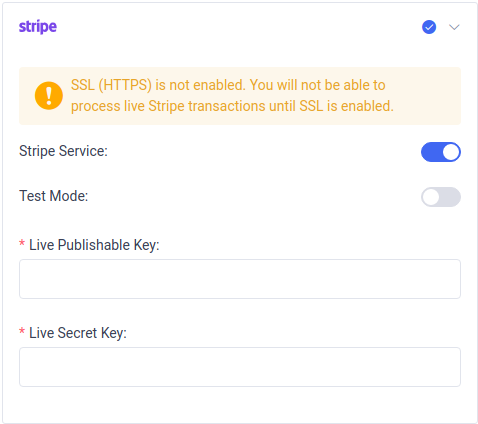 To enable the Stripe Payment method, enable the “Stripe Service” option, after which you can enable the “Test Mode” to run tests with Stripe. When you enable “Test Mode” you need to add “Test Publishable Key” and “Test Secret Key”. To use live transactions, you should leave “Test Mode” disabled, and enter the “Live Publishable Key” and “Live Secret Key” that are located on your Stripe dashboard.