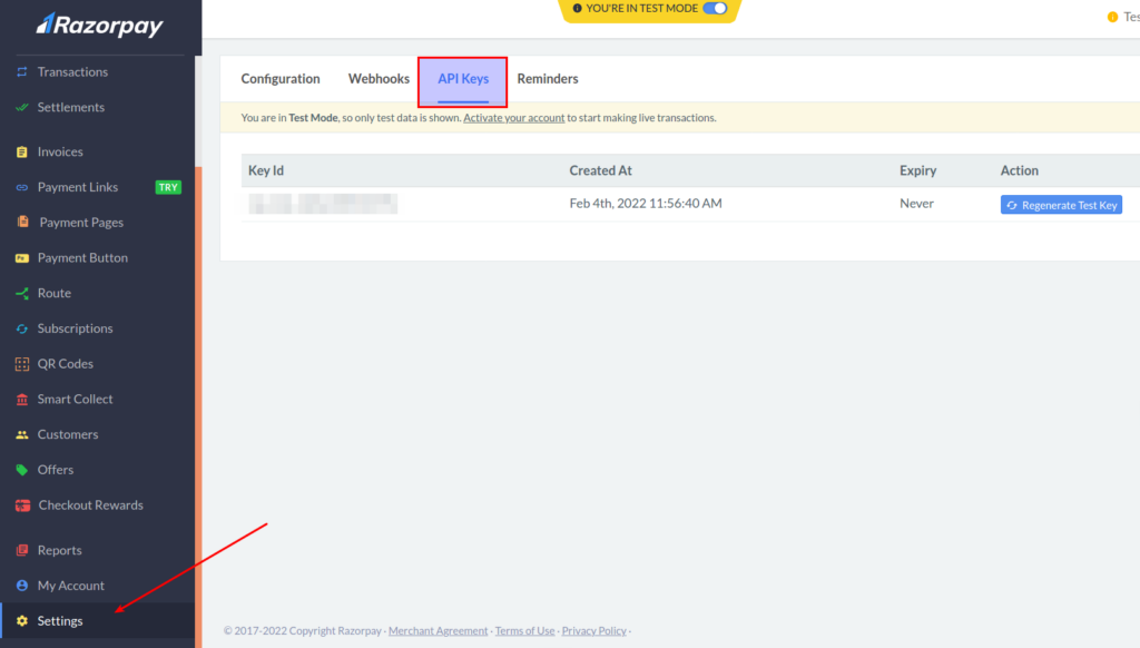 In order to provide Key ID and Secret in Amelia for Razorpay, you need to create an API Key first on your Razorpay account, and then copy them to corresponding fields on the Settings page in Amelia. In order to create the API key, login to your Razorpay account, choose the mode that you want to create the API Key for – live or test, and then navigate to Settings -> API Keys -> Generate Key to generate the key. The Key ID and Key Secret will appear on a pop-up page and you need to copy these and paste them to the corresponding fields in Amelia. If you need more help in generating the keys in Razorpay, you can find more information on this Razorpay docs page.