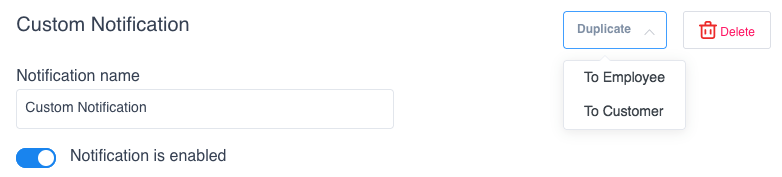 When you Create the notification and open/edit it, instead of the Discard button in the top right corner, there will be the Duplicate and Delete options, so you can easily duplicate the notification if you need that, you can choose if the duplicate would be created for the employee or the customer, or delete it.