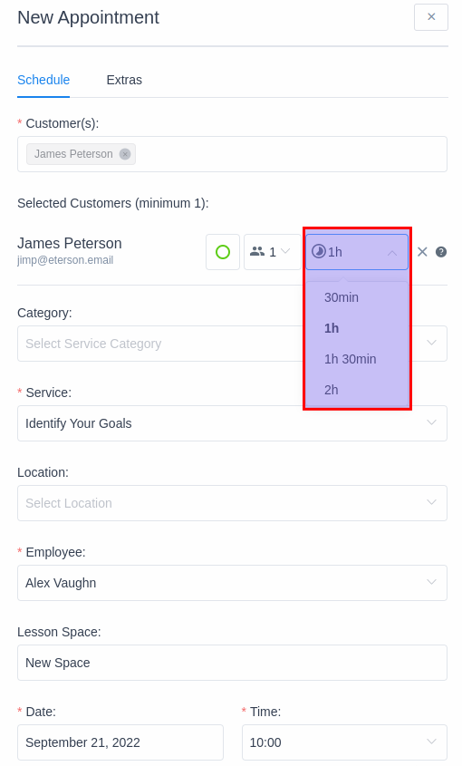 Just like in the front-end booking form, this is a drop-down menu that automatically selects the default duration and that can be changed to any of the Custom Duration periods added in the Service.