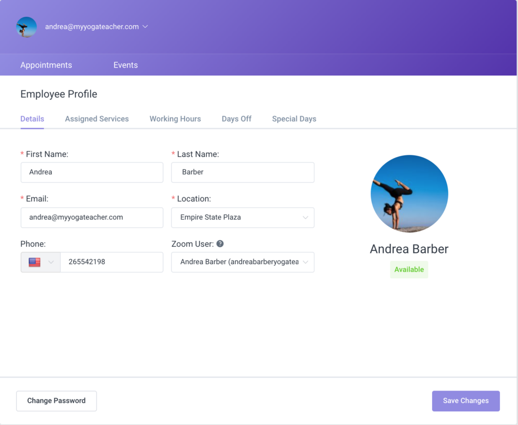 Front-end Employee Panel allows you to offer your employees an easy way to manage their appointments and events and edit their profile from the front-end page without the need for logging into WordPress. On our demo site here you can take a look and try our Front-end employee panel.