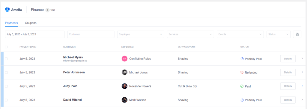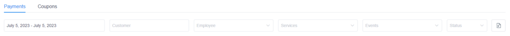 Payments for appointments and events are stored on the same screen and you’ll be able to see what the payment is for in the “Service/Event” column. Since the events have the option for assigning multiple employees, in the “Employee” column you can see multiple employees assigned.