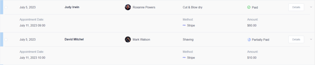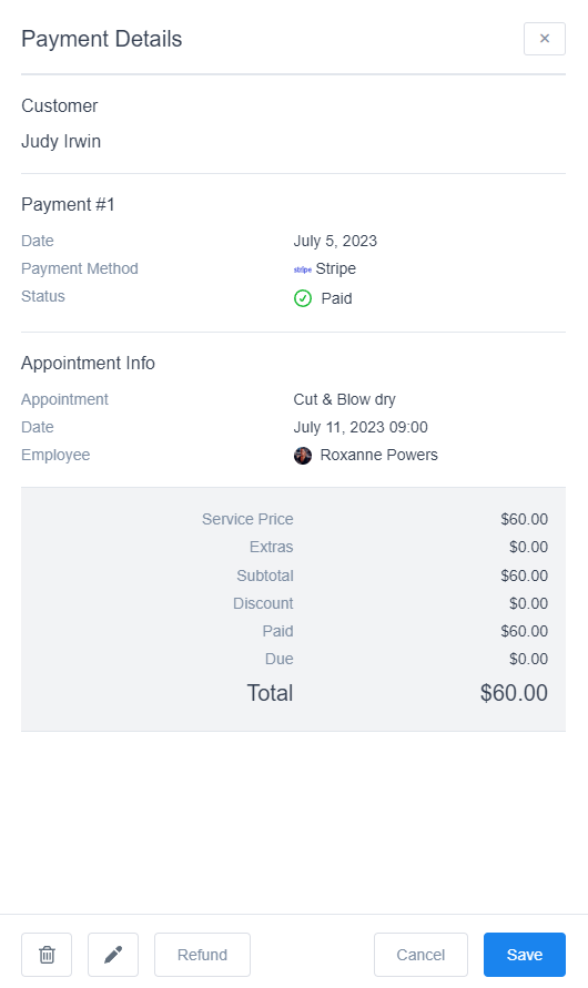 Payments passed through online payment methods (PayPal, Stripe, Mollie, RazorPay, or WooCommerce) automatically have a “Paid” or “Partially Paid“ status. For a payment using an “On-site” method, the payment status and paid amount have to be updated manually. Click the “Details” button to open the details dialog for the chosen payment. Here you can see the detailed information for the individual payment, change the payment data, refund, or delete the payment. By clicking on the “Pen” icon in the dialog footer, a small dialog will appear from where you can update the paid amount and the payment status.