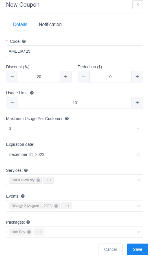 To create a new coupon simply click on the “+ New Coupon” button located at the top of the page. After opening a dialog you need to provide the “code” for your coupon (coupon name that customers will enter to get a discount), “discount” (expressed in percentage), “deduction” (reduced amount of selected “Currency” setting in the “Payments Settings”), the usage limit, the usage limit per customer, the expiration date of the coupon, and select the Service(s), Package(s), and/or Event(s) the coupon is valid on.