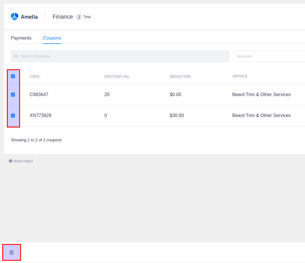 You can delete multiple coupons at the same time by checking the coupons you want to delete. The dialog box will appear at the bottom of the page when you check at least one coupon you want to delete. Once you are certain that you want to delete the coupons click the “Trash” icon and then the “Delete” button.